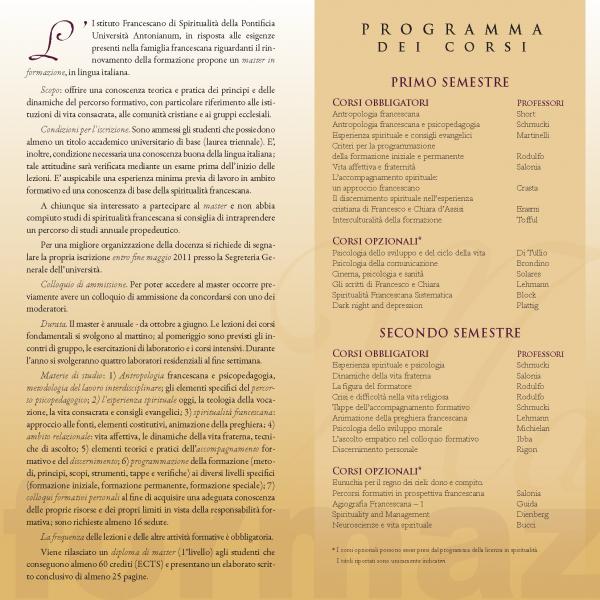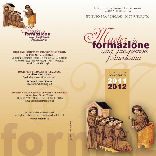 L’Istituto Francescano di Spiritualità della Pontificia Università Antonianum, in risposta alle esigenze presenti nella famiglia francescana riguardanti il rinnovamento della formazione, propone un master in formazione (1° livello) in lingua italiana.