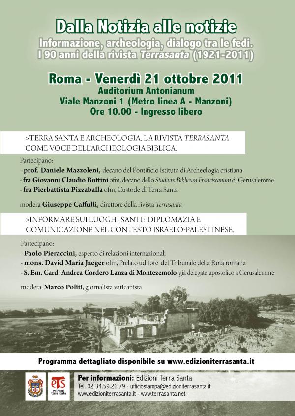 La Custodia di Terra Santa, in occasione dei 90 anni della sua rivista, organizza un convegno che si terrà venerdì 21 ottobre, alle ore 10.00, presso l'auditorium Antonianum, via Manzoni 1, Roma. Più informazioni nel file allegato.